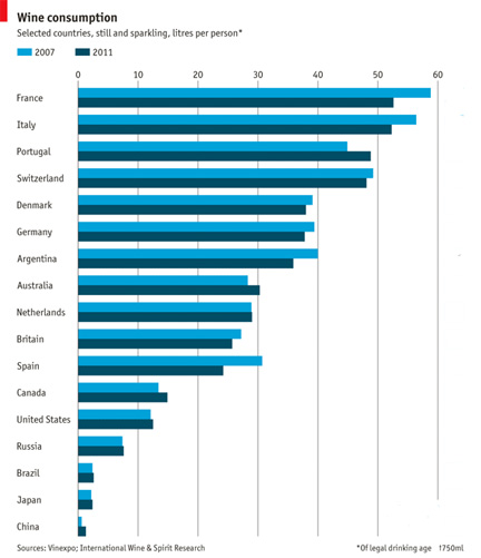 Over the past few years, much has been made of the fact that more wine by volume is now consumed in America than in France and in any other single country in the world. This is a striking factoid, but it only means that there are lots more people in the United States than European countries and lots more high income folks.
