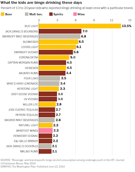 A new study out of Boston University and Johns Hopkins University identifies the brands of alcohol 13-20 year olds reach for when they binge drink. Courtesy of the Washington Post report is this graphic: