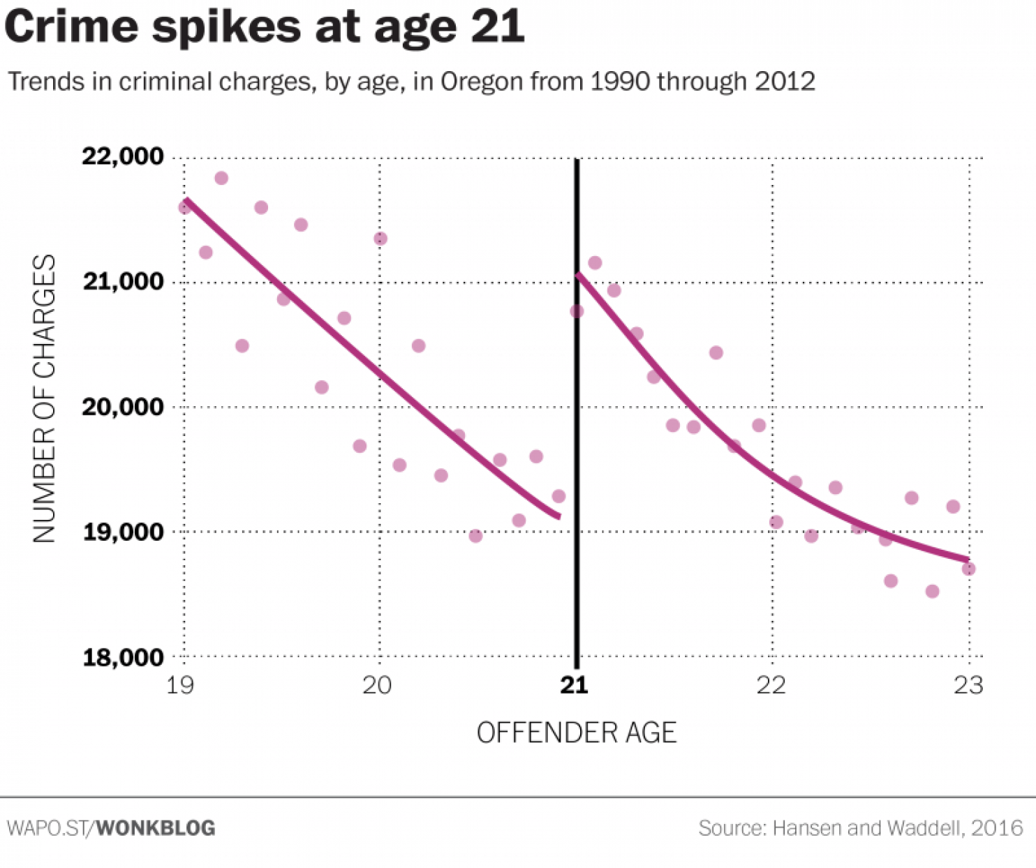 In a fascinating chart highlighted at Wine Industry Insight and written about at the Washington Post, we learn that access to alcohol due to turning 21 years old absolutely results in increased crime. It’s not something you might think about, but when you see the data in a graphic you realized, “of course it does.”