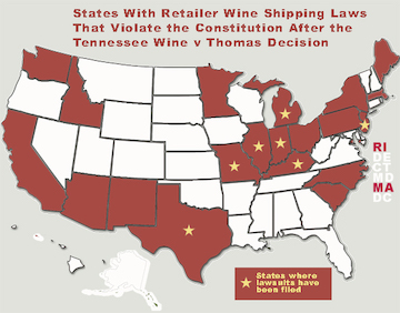Recently the National Association of Wine Retailers released a map that showed which states, in the wake of the recent Tennessee Wine v Thomas Supreme Court decision, have unconstitutional wine retailer shipping laws on the books. Most of these unconstitutional laws are your run-of-the-mill protectionist, anti-competitive laws that ban out-of-state wine retailers from shipping in while allowing their own in-state retailers to ship wine to residents. However, some of these states’ retailer wine shipping laws are unconstitutional due to their reciprocal shipping provisions.